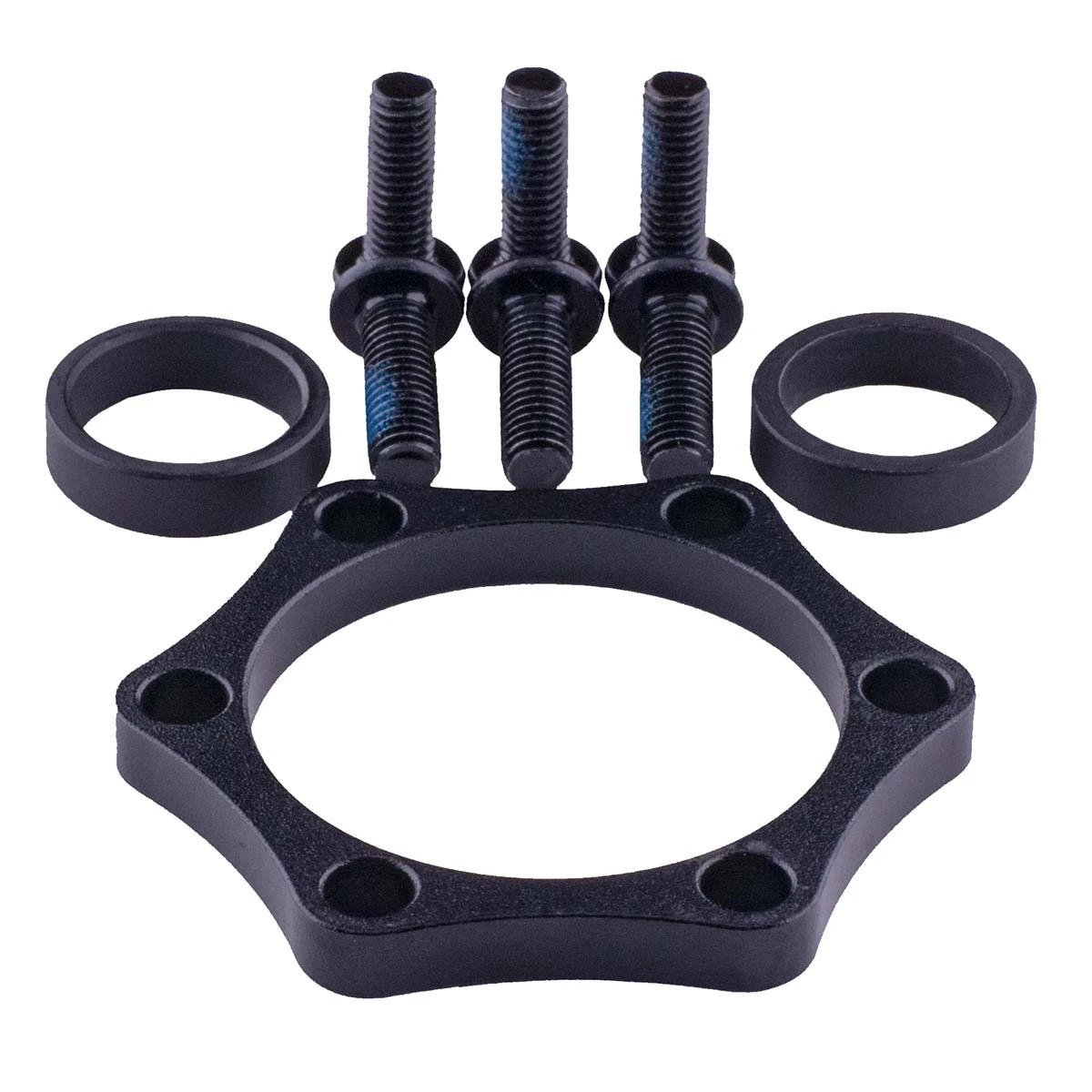 Set voor het verbreden van een klassieke naaf (15 x 100 mm) naar de Boost standaard (15 x 110 mm). De set bevat twee afstandsbusjes van elk 5 mm om de as te verbreden, een 5 mm adapterplaatje voor de remschijf en 6 stuks lange remschijfbouten (M5 x 15).